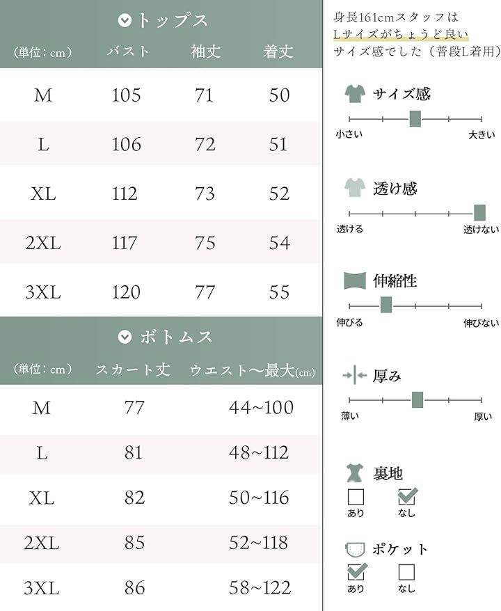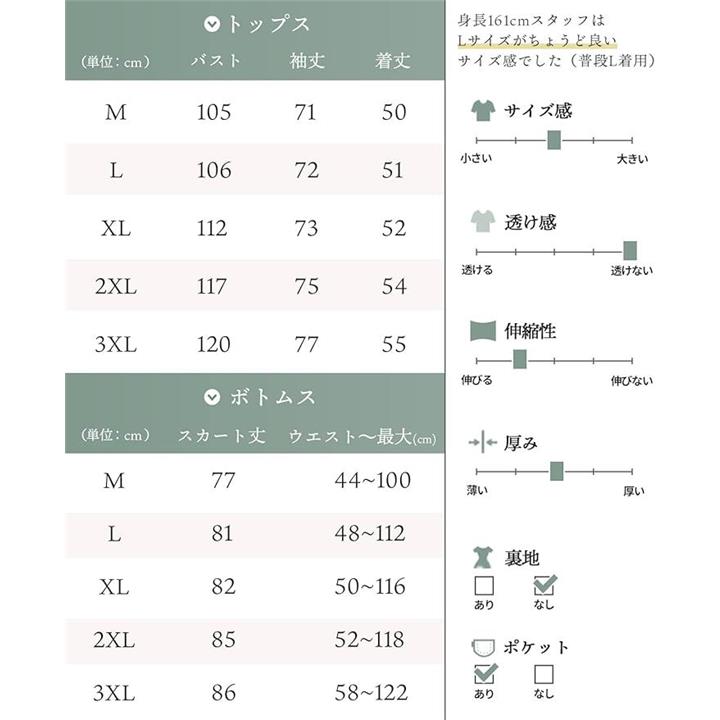 サイズ:「トップス」バスト/袖丈/着丈(cm) (M)105/71/50 (L)106/72/51 (XL)112/73/52 (2XL)117/75/54 (3XL)120/77/55 「スカート」スカート丈/ウエスト~最大(cm) (M)77/44-100 (L)81/48-112 (XL)82/50-116 (2XL)85/52-118 (3XL)86/58-122 *寸法は平置きにて計測し、若干の誤差がある場合がございます。