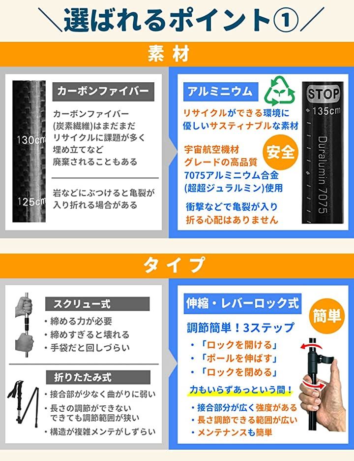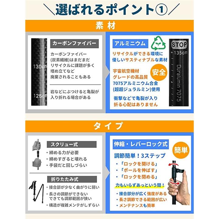 そのためカーボンより丈夫で折れにくく安定した登山ができるのが特徴の トレッキングポール です。
