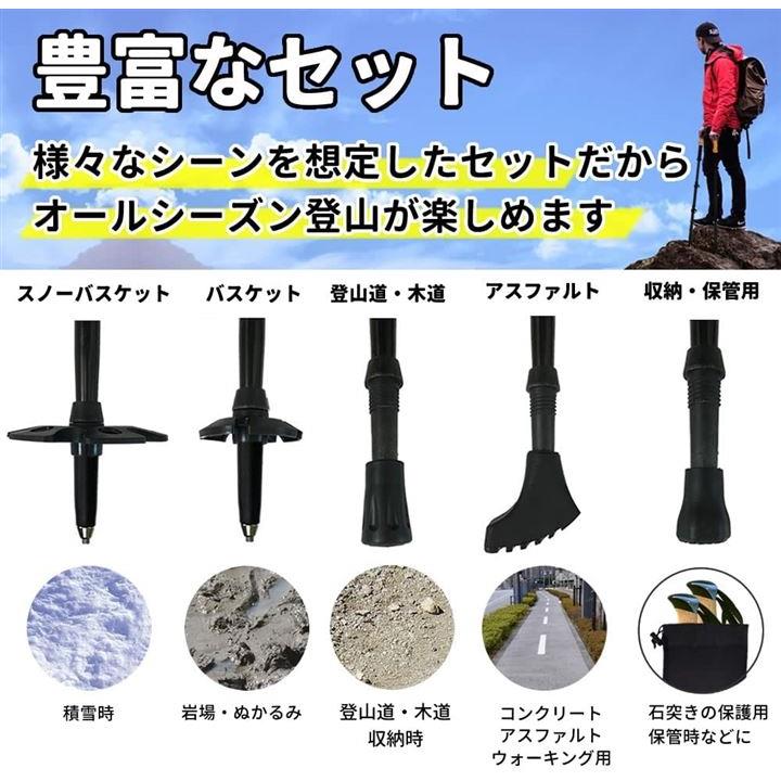 こちらはトレッキングに使用するとすぐ外れますので、トレッキング時は専用のキャップをご利用ください)・トレッキング用キャップ(長い方)・ウォーキング用 キャップ ・バスケット・スノーバスケット)日本語取扱説明書:1枚 オリジナルの収納袋:1枚