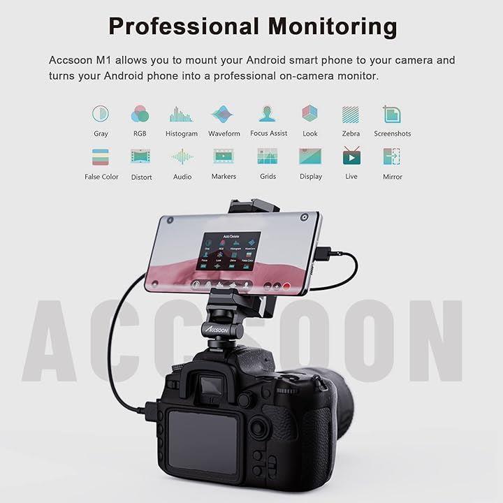 Accsoon M1を使用すると、Androidスマートフォンをカメラにマウントして、Androidスマートフォンをプロ仕様のオンカメラモニターに変えることができます。