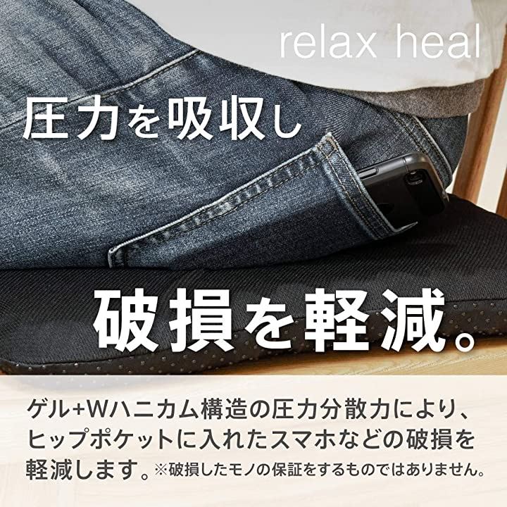 ゲル素材とハニカム構造で、一点にかかる体圧を分散。だから無重力クッションならヒップポケットに入れたまま椅子に座っても、ゲルとハニカム構造が体重を分散させるので、スマホやタバコが潰れない。不意な破損事故からしっかりと守ってくれます。