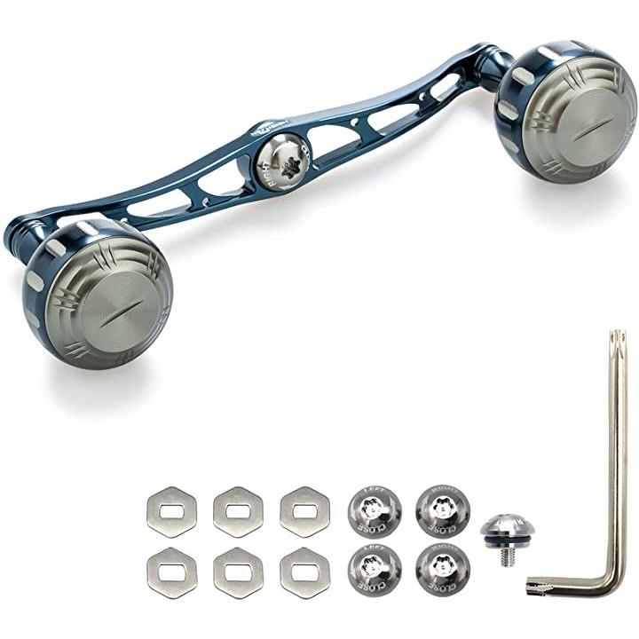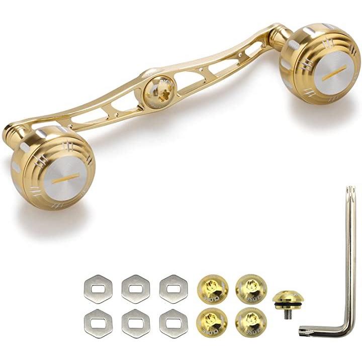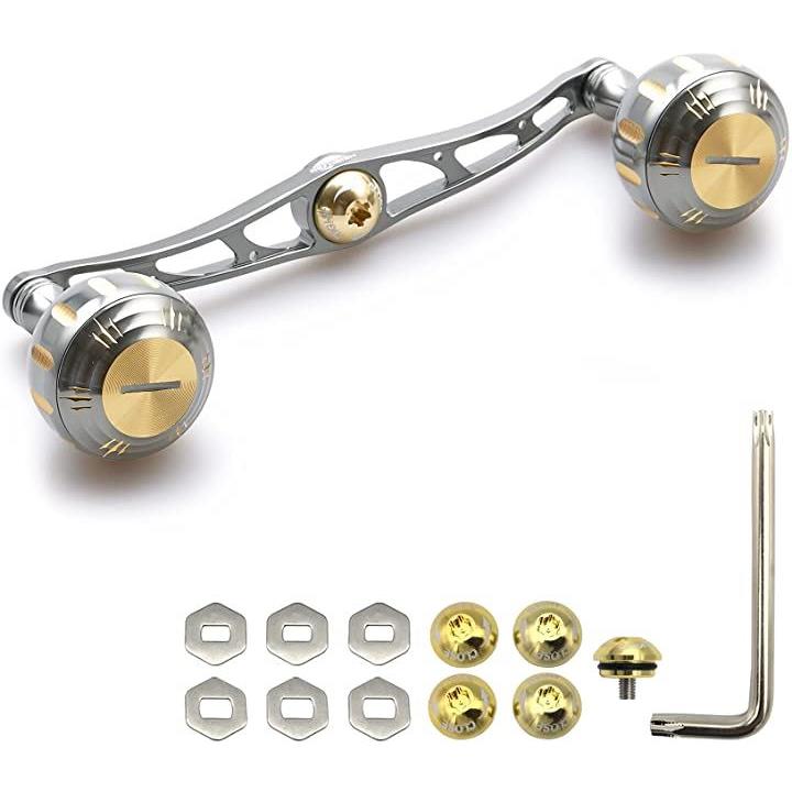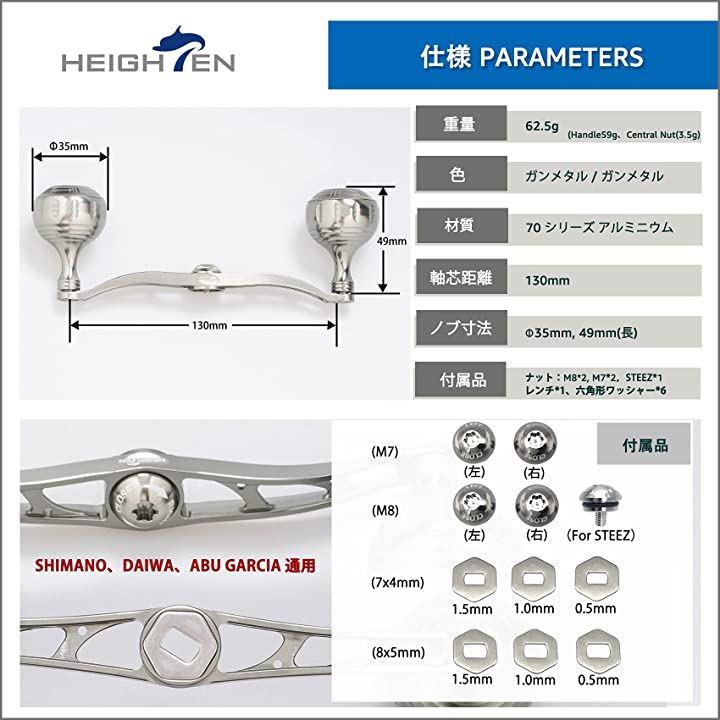 ・「サイズ」ノブ直径35mm、ハンドル軸心距離130mm 「総重」62.5g「素材」70シリーズ航空アルミ「リールハンドル付属」DAIWA ナット2個、SHIMANO ナット2個、DAIWA STEEZ ナット1個、6角ワッシャー 6個(取付部4x7mm、5x8mm)、梅レンチ1個。