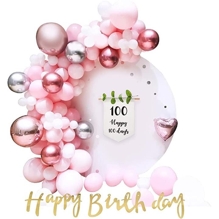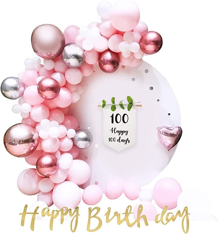 ゴールドHAPPYBIRTHDAYガーランドx1タペストリー(100日・1/2・1歳)x1バルーン107個(ローズ(大)x2、ピンク(大)x5、メタリックレッド(中)x5、ホワイト(中)x10、ピンク(中)x60、メタリックシルバー(中)x5、ホワイト(小)x20)空気入れ(ピンク)x1