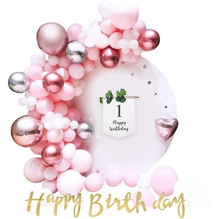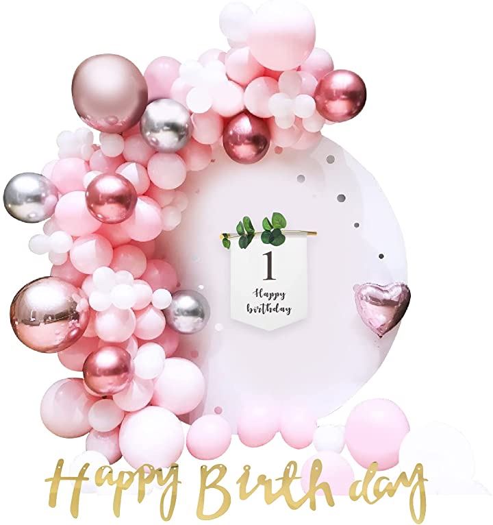 ゴールドHAPPYBIRTHDAYガーランドx1タペストリー(100日・1/2・1歳)x1バルーン107個(ローズ(大)x2、ピンク(大)x5、メタリックレッド(中)x5、ホワイト(中)x10、ピンク(中)x60、メタリックシルバー(中)x5、ホワイト(小)x20)空気入れ(ピンク)x1
