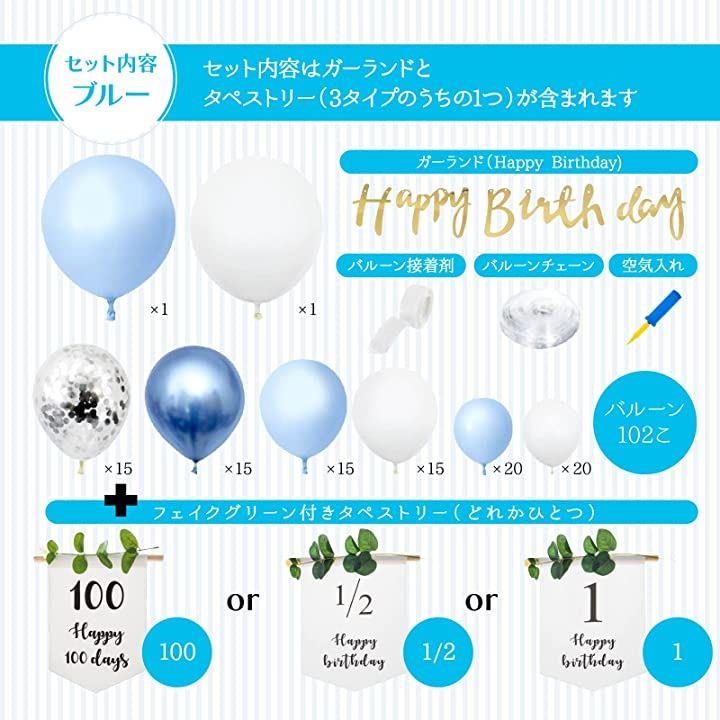 ゴールドHAPPYBIRTHDAYガーランドx1タペストリー(100日・1/2・1歳)x1バルーン102個(ブルー(大)x1、ホワイト(大)x1、シルバーコンフェッティ(中)x15、メタリックブルー(大)x15、ブルー(中)x15、ホワイト(中)x15、ホワイト(小)x20、ブルー(小)x20)空気入れ(ブルー)x1