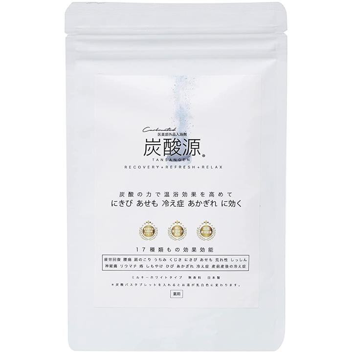 ・「炭酸源の特徴」 炭酸源(TANSANGEN)は、タブレットの有効成分となっている無機塩類 (ナトリウム) と酸 (リンゴ酸)がお湯(水)に反応することで、温浴効果が高まる炭酸ガスが勢い良く発生する重炭酸の入浴剤です。