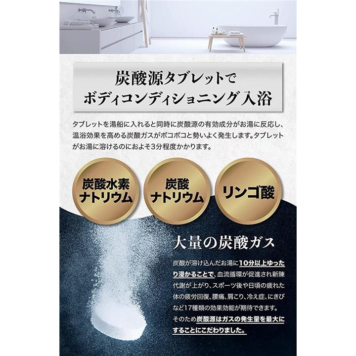 ・「炭酸源の使用方法」 炭酸源はタブレット1錠で炭酸ガスを発生する成分配合となっているため、約180~220Lの35℃~42℃のお湯に1錠でお使い頂けます。