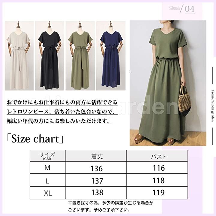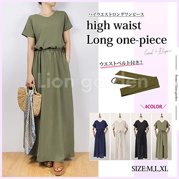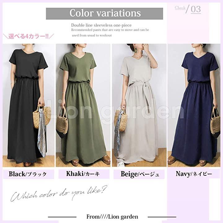 [ライオンガーデン]4色展開サマーワンピース夏半袖ロングワンピースシンプル無地M~XLレディースネイビー ブラック ベージュ グリーン MLXLフェミニンなムードあふれる落ち着いたカラーのワンピースが半袖になって登場です。