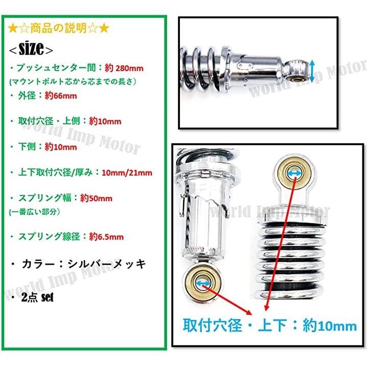・**商品説明** v size:プッシュセンター間:約 280mm (マウントボルト芯から芯までの長さ) ・ 外径:約66mm ・ 取付穴径・上側:約10mm ・ 下側:約10mm ・ 上下取付穴径/厚み:10mm/21mm ・ スプリング幅:約50mm (一番広い部分) ・ スプリング線径:約6.5mm v カラー:シルバーメッキ v 2点set
