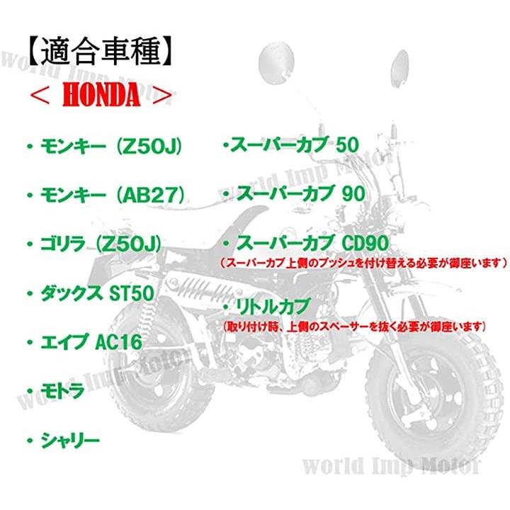 ・v「適合車種」 v < honda (ホンダ) 用 オートバイ > ・ モンキー (Z50J) (AB27) ・ ゴリラ (Z50J) ・ ダックス ST50 ・ エイプ AC16 ・ モトラ ・ シャリー ・ スーパーカブ 50 ・ スーパーカブ 90 ・ スーパーカブ CD90 (スーパーカブ上側のブッシュを付け替える必要御座います) ・ マグナ250 V-TWIN ・ yb-1 ・ yb-1four ・ GZ125HS ・ リトルカブ (取り付け時、上側のスペーサーを抜く必要が御座います)