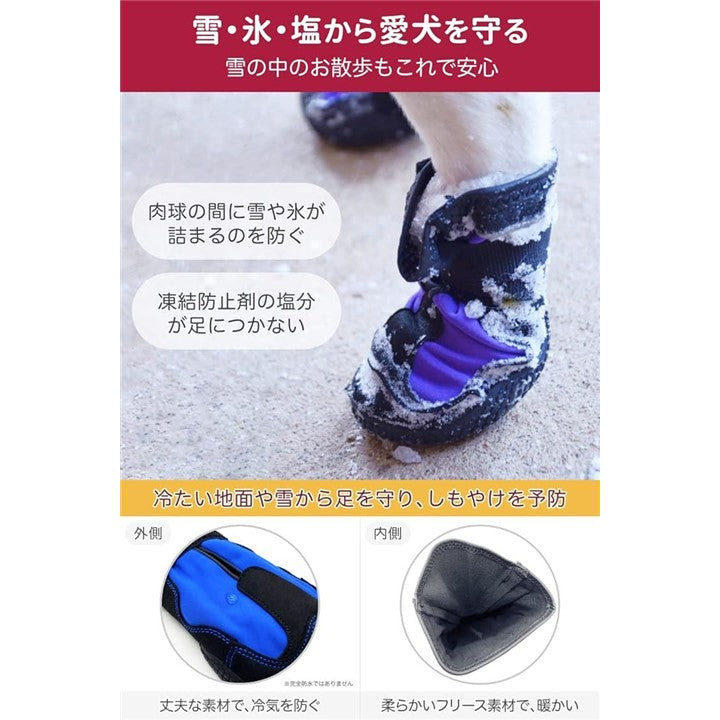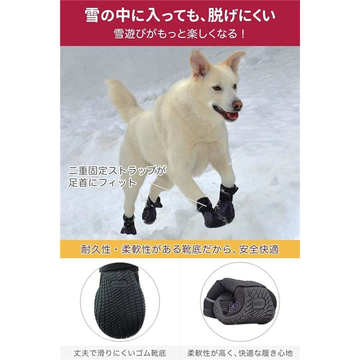 雪や氷、凍結防止剤の塩分から大切なワンちゃんの足を守り、スノーシューや雪遊びのときにも最適です。