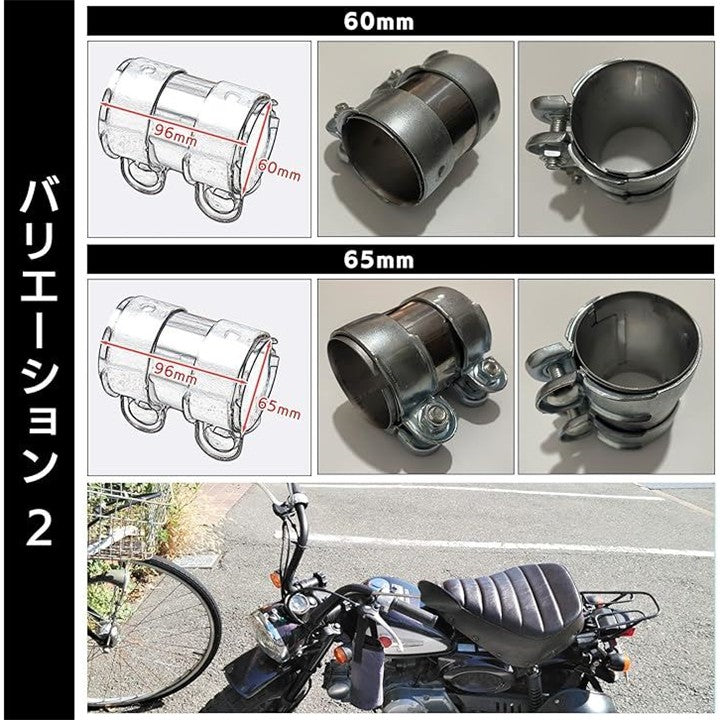 「バリエーション」45mm、51mm、55mm、マフラーばんど 60、65mmのサイズをご用意しており、詳細サイズは画像をご参照いただき、ご自身のバイクや自動車に合ったサイズを選択いただけます。