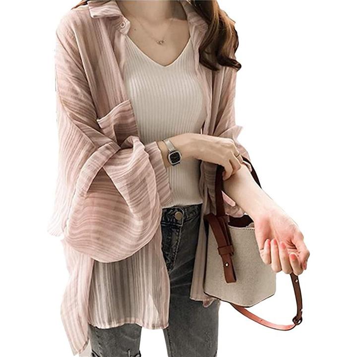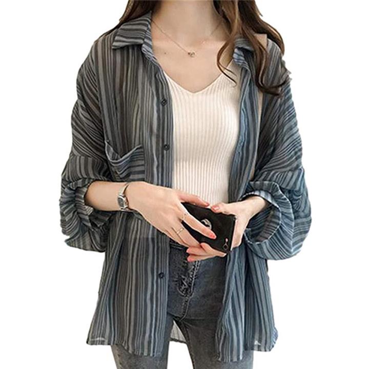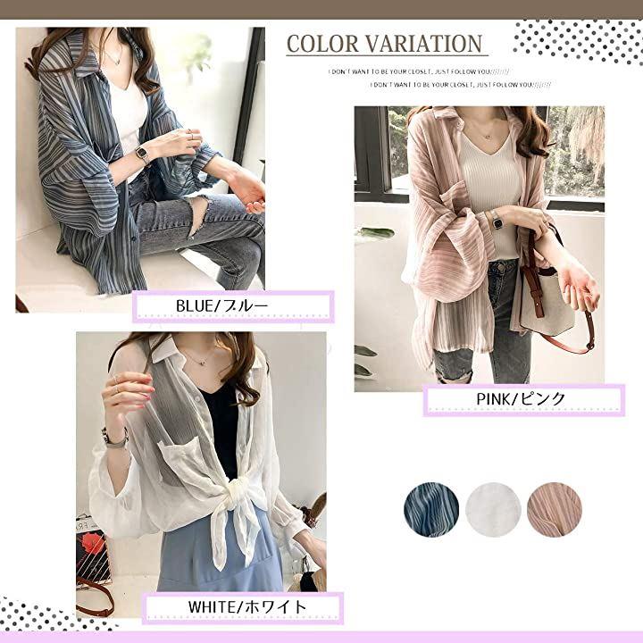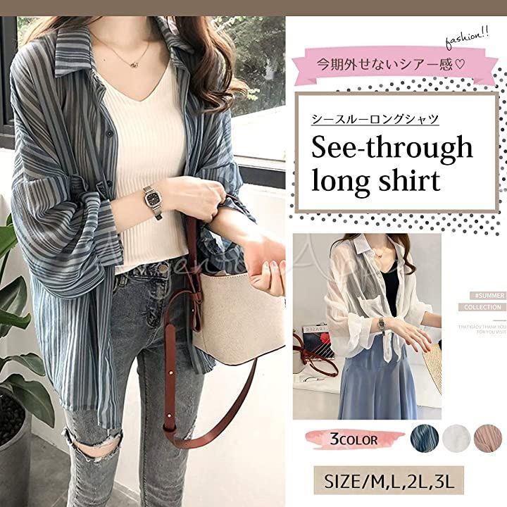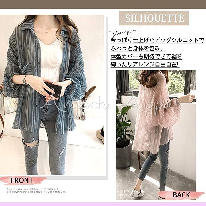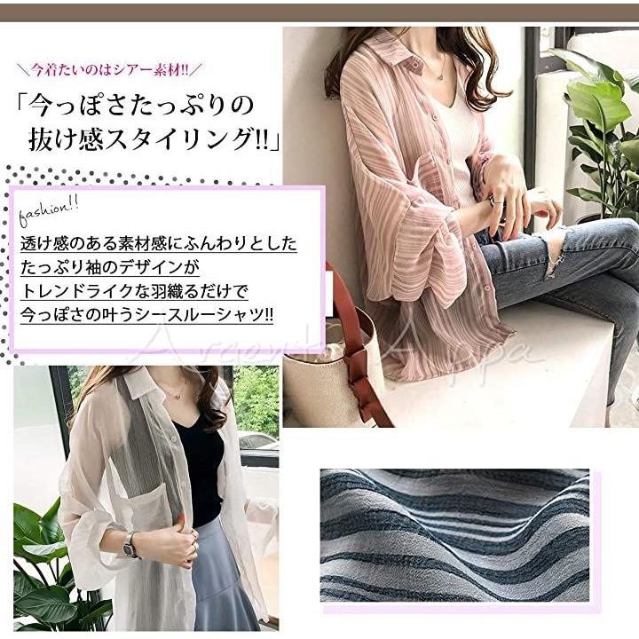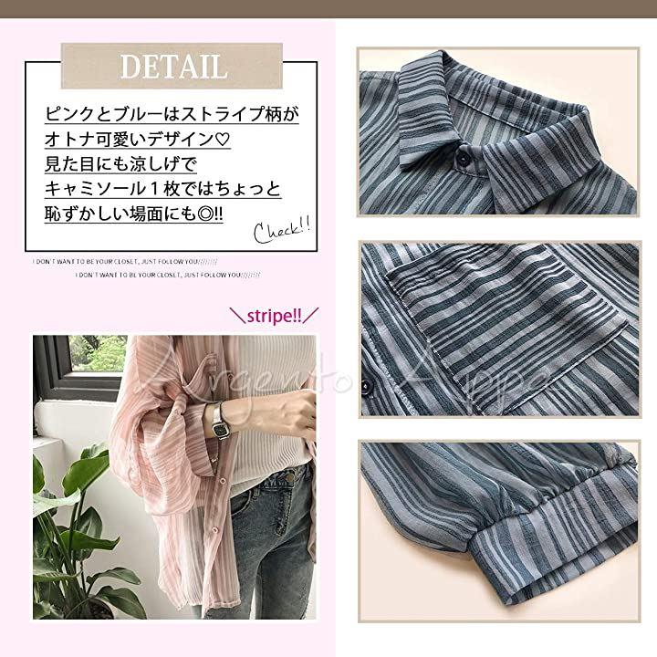 アルジェント アパ シャツ ストライプ 透け感 とろみ パフスリーブ 冷房対策 襟付き オフィスカジュアル カーディガン風 M~3L