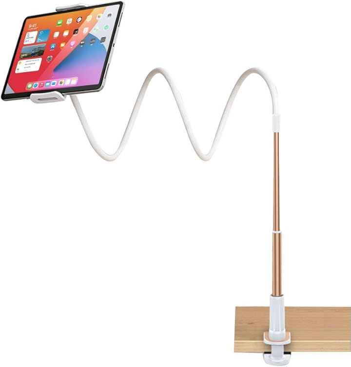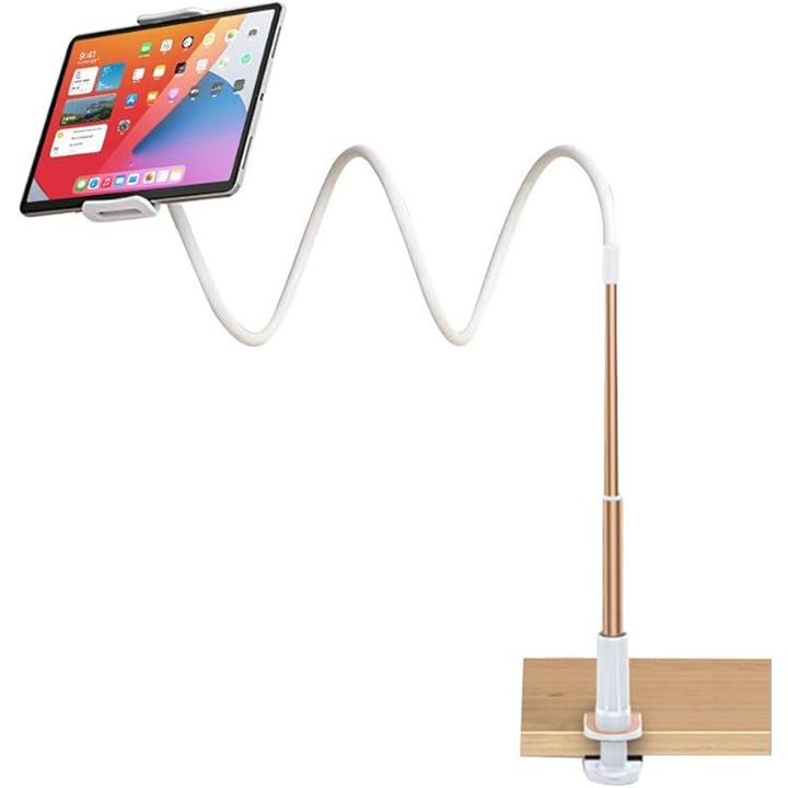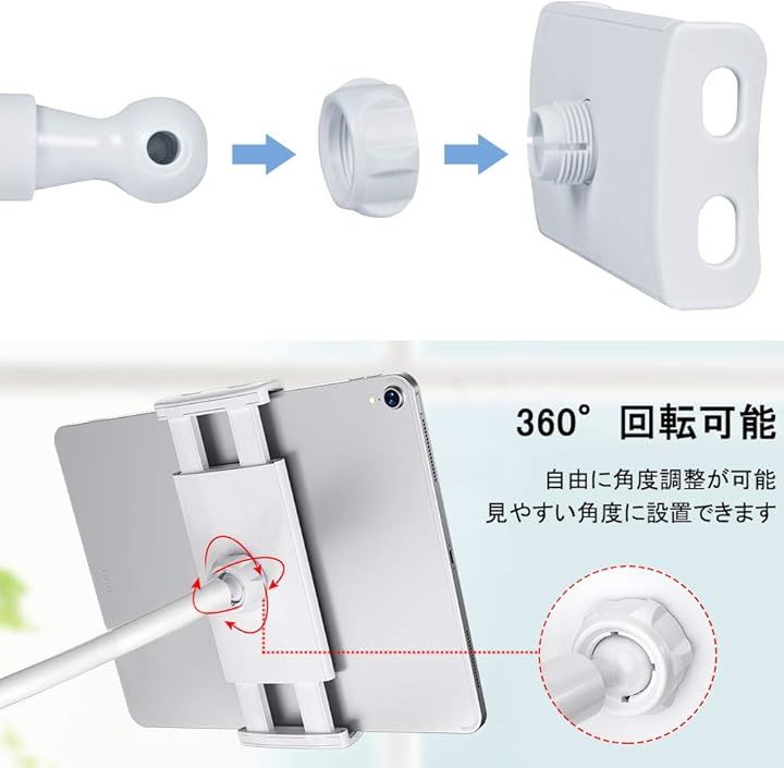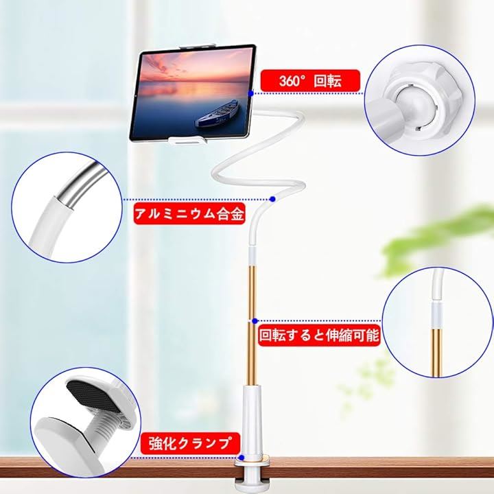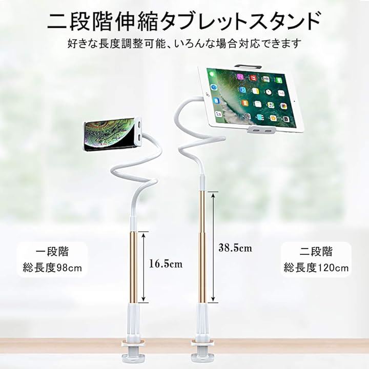 ・「二段階伸縮タブレットスタンド」改良版タブレットスタンドは二段階伸縮設計を採用しており、白色部分を握て、金色部分を左右ぐるぐる回して、下に引っ張られます。