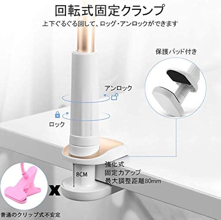 強化クランプは滑り止めシリコン保護パッドも付いて,机、ベッドに傷防止だけでなく、安定性もアップです。