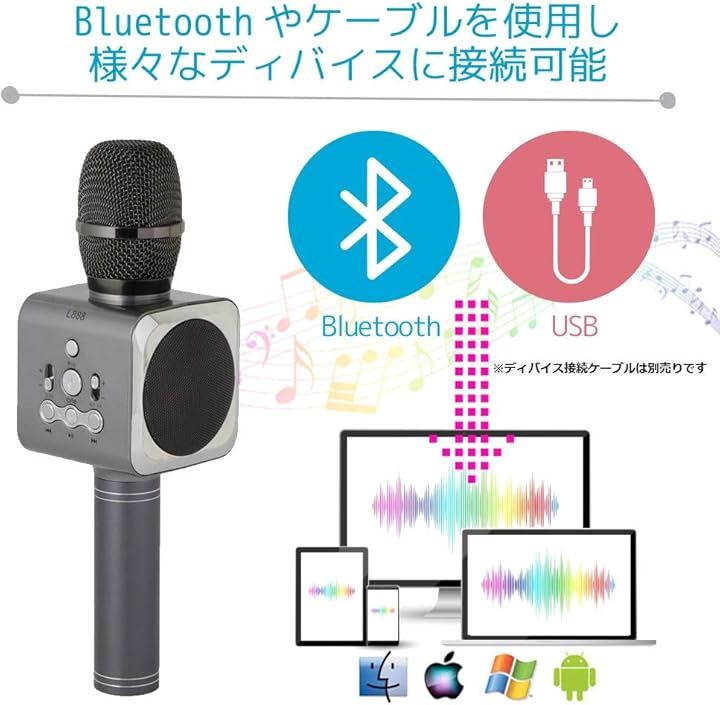 Bluetooth機能や専用のケーブルを使用して、パソコンやスマートフォンと連動することができるマイクは、自分のお気に入りの曲で楽しむことができるため、練習用にもパーティー用にも最適。