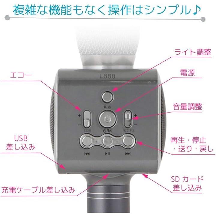 多彩なライトでの装飾機能、エコー機能、有線利用も可能で、Bluetooth、オーディオ系のケーブルやTFカードなどで曲を再生できるモード機能が選択可能です。
