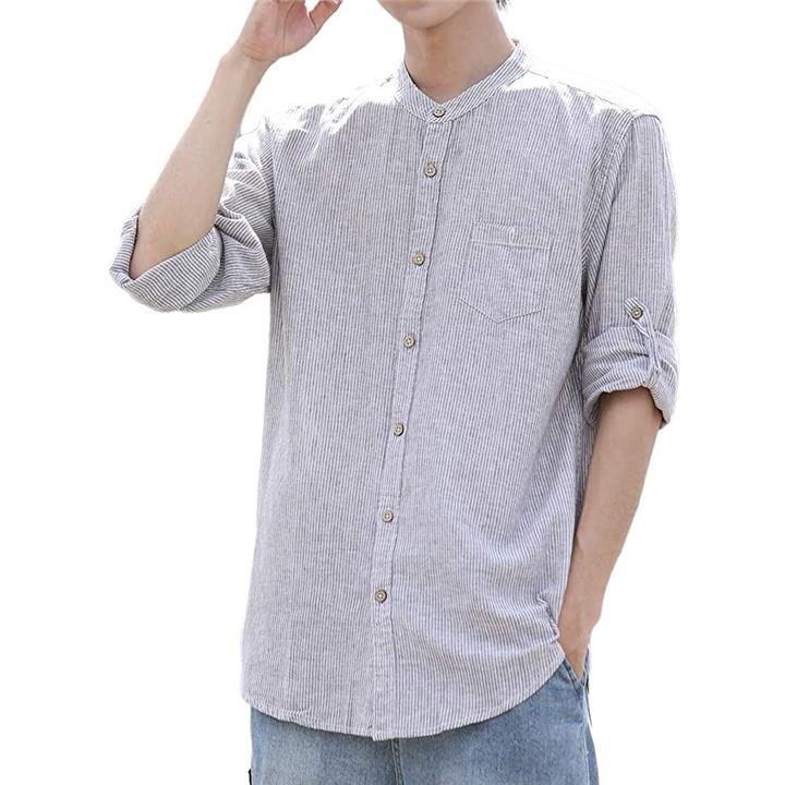・ナチュラルでおしゃれな雰囲気を演出してくれるピンストライプ柄のバンドカラーシャツです。