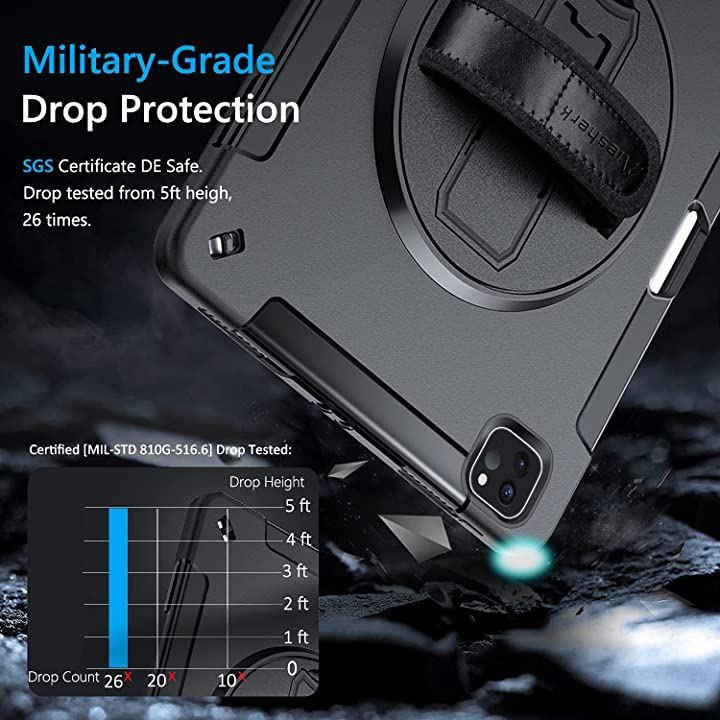 互換品 iPadPro12.9 ケース 2022/2021 ミリタリーグレード 高耐久 耐衝撃カバー iPadPro12.9インチ 第6/第5世代 - ペンシルホルダー 回転スタンド ハンド/ショルダーストラップ
