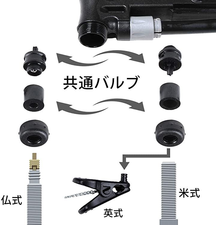 ・「ロードバイク、クロスバイク、MTB(マウンテンバイク)、ミニベロ、ママチャリ、子供用、電動自転車にも対応」v空気を入れるポンプ口金を交換できますので、仏式(フレンチバルブ)、米式、英式のバルブにも対応可能です。