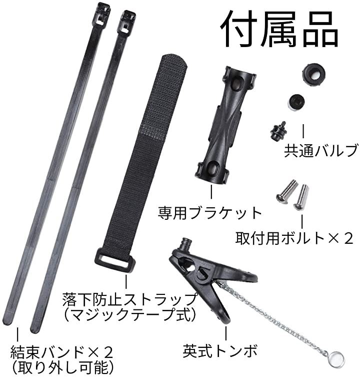 v自転車への取り付けにも便利な付属品あり「パッケージ内容 」v英式トンボ口金、専用ブラケット、固定用バンドx2、ボトルゲージ台座取付用ネジx2