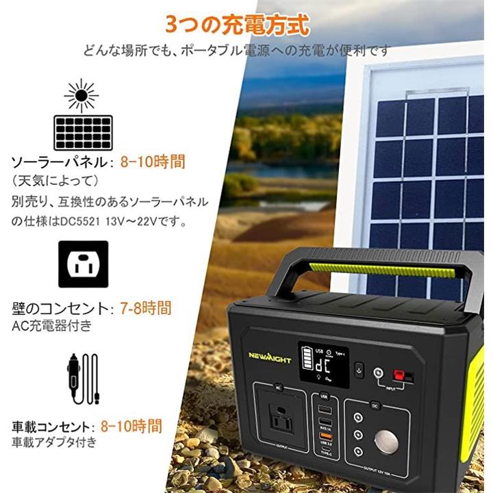 ・「3 Way充電式」Newmight 非常用電源は、互換性のある100Wソーラーパネル(含まず)を8-10時間以内に太陽エネルギーから完全に充電可能。