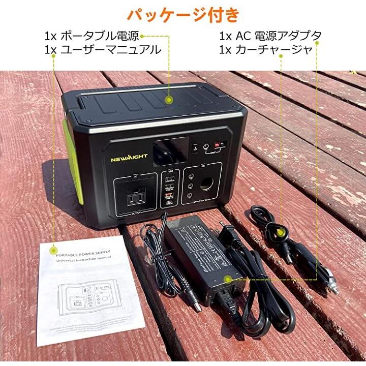 ・「商品内容」1x 400Whポータブル電源、1xAC電源アダプタ、1x車載充電器、1xユーザーマニュアル。
