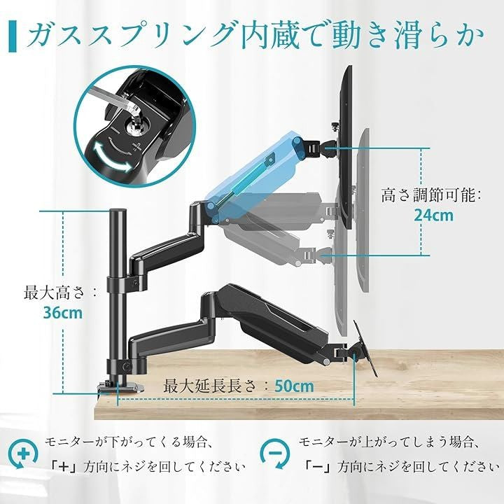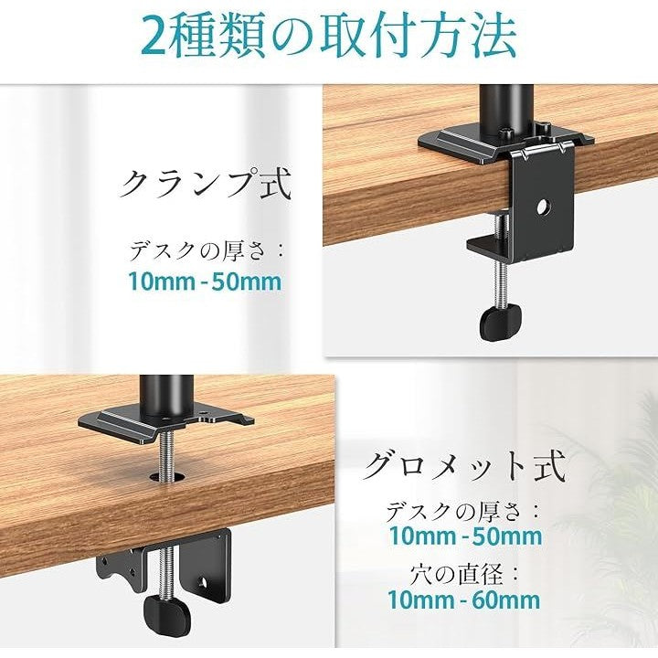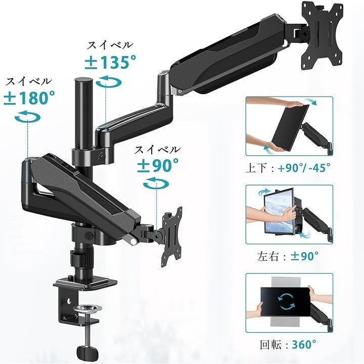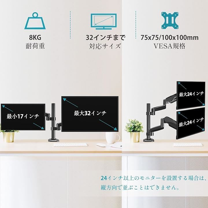 モニタアーム 2画面 液晶ディスプレイアーム デュアル ガススプリング 16~32インチ対応 縦並び 耐荷重2~8kg VESA75x75 100x100 グロメット式 クランプ式 ポール アーム付き 角度調節