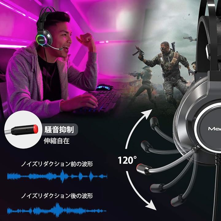 ・「良質マイク」:ヘッドセットのマイクは上下120°調節でき、ノイズキャンセリング技術を用いており、ノイズの影響を低減し、外部ノイズを遮断できる効果があります。
