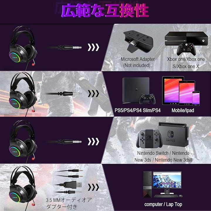 ・「幅広い互換性」:直径3.5mm 4極コネクター付き、パソコンとXbox One(付属3極のアダプタケーブルで接続必要),Switch(イヤホンだけ使用できます、マイクに対応できません)、ノートパソコン、タブレット、PS4、PS vita、iPad、iPhone、Macbookやスマートフォンなど3.5mm 4極単穴オーディオ設備に対応できます。