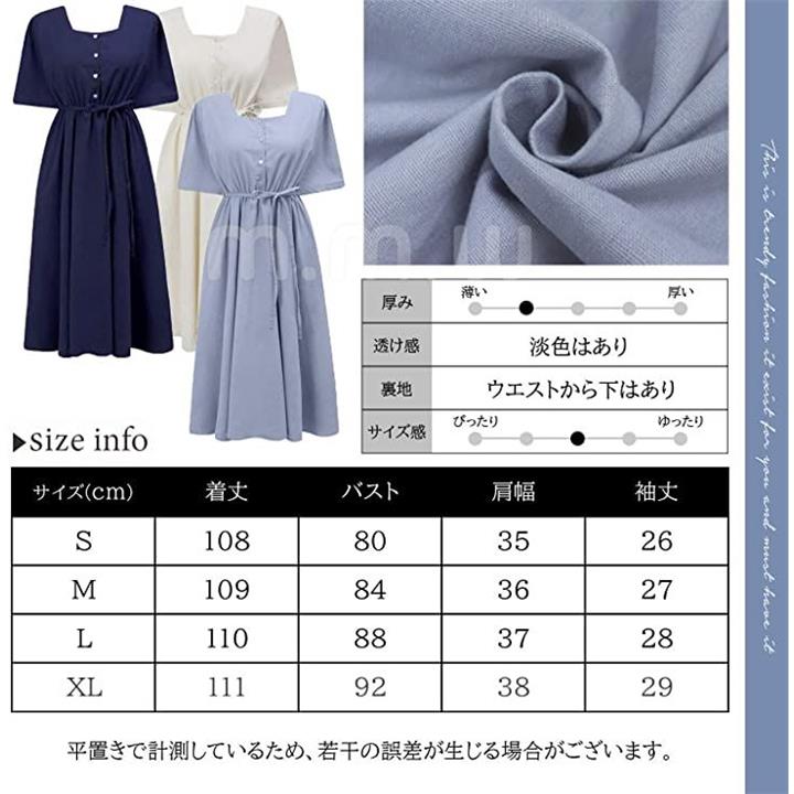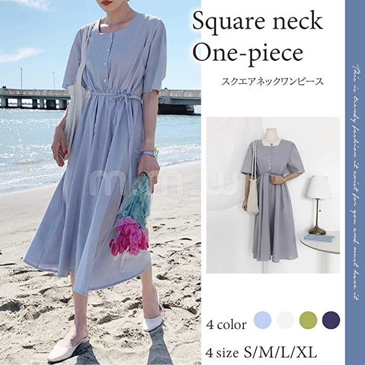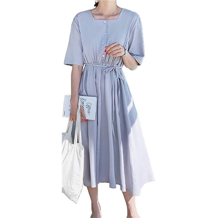 [m.m.w(エムエムダブリュ)] レディース ワンピース 半袖 スクエアネック ウエスマーク ハートボタン ミモレ丈 オシャレ ガーリーM~XL (ライトブルー, XL) |