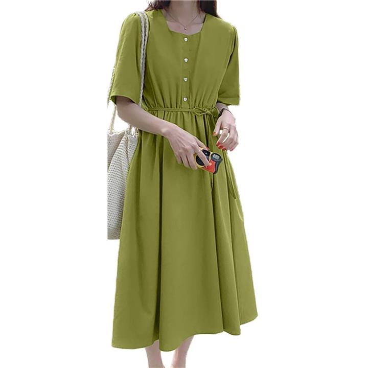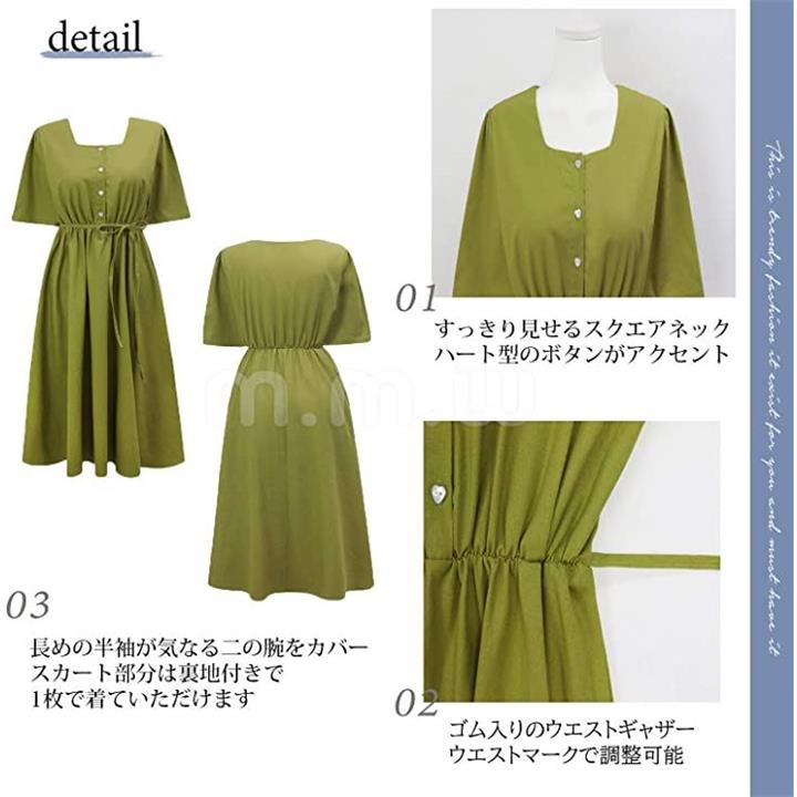 [m.m.w(エムエムダブリュ)] レディース ワンピース 半袖 スクエアネック ウエスマーク ハートボタン ミモレ丈 オシャレ ガーリーM~XL (グラスグリーン, XL) |