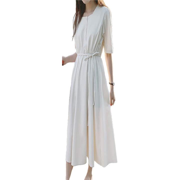 [m.m.w(エムエムダブリュ)] レディース ワンピース 半袖 スクエアネック ウエスマーク ハートボタン ミモレ丈 オシャレ ガーリーM~XL (オフホワイト, XL) |