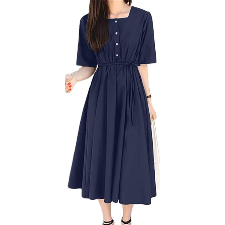 [m.m.w(エムエムダブリュ)] レディース ワンピース 半袖 スクエアネック ウエスマーク ハートボタン ミモレ丈 オシャレ ガーリーM~XL (ネイビー, L) |