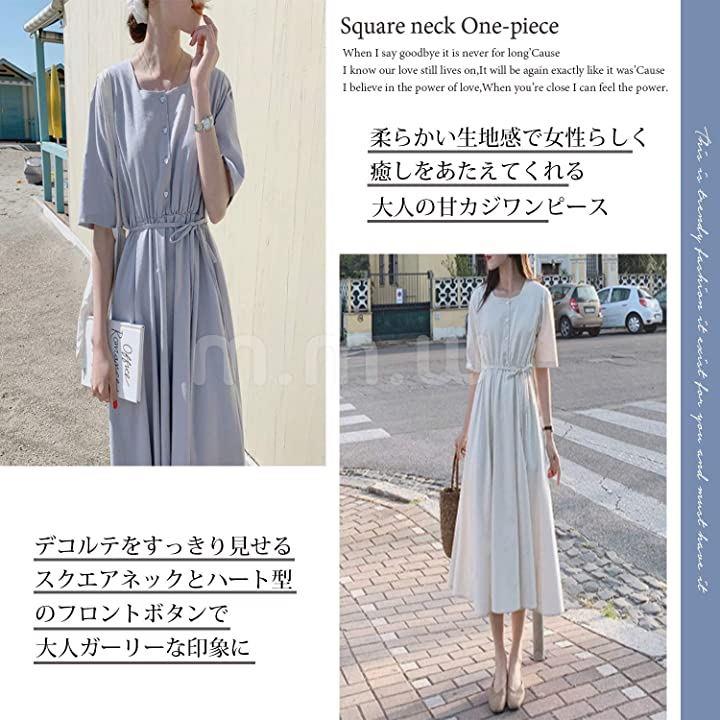 [m.m.w(エムエムダブリュ)] レディース ワンピース 半袖 スクエアネック ウエスマーク ハートボタン ミモレ丈 オシャレ ガーリーM~XL (ライトブルー, L) |
