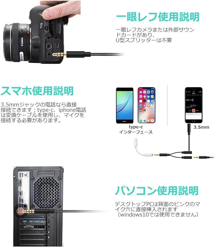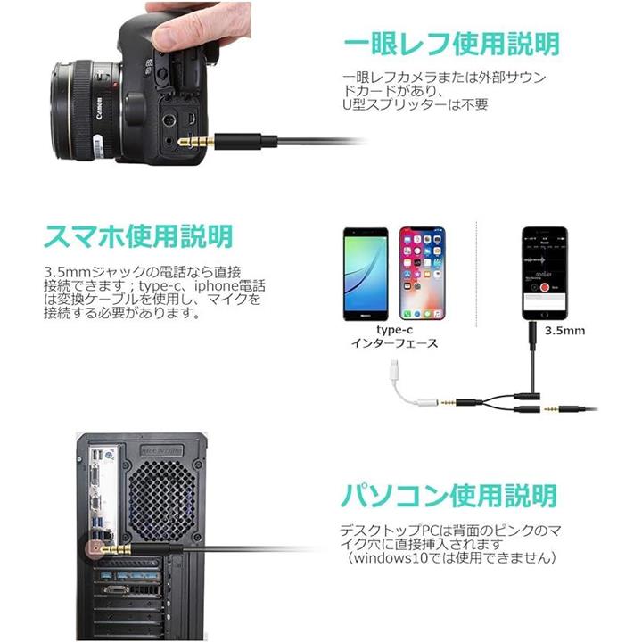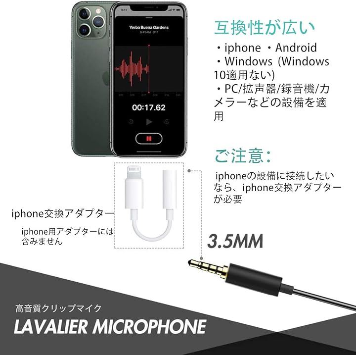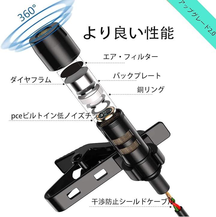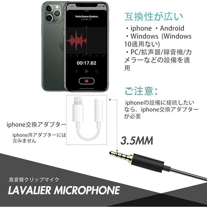 互換品ピンマイク コンデンサーマイク クリップマイク 高音質 スマホマイク 低ノイズ ミニマイク クリップ付き iPhone/iPad/Android/pc/カメラ 対応 3.5mmプラグ 1.5mケーブル 収納袋付属