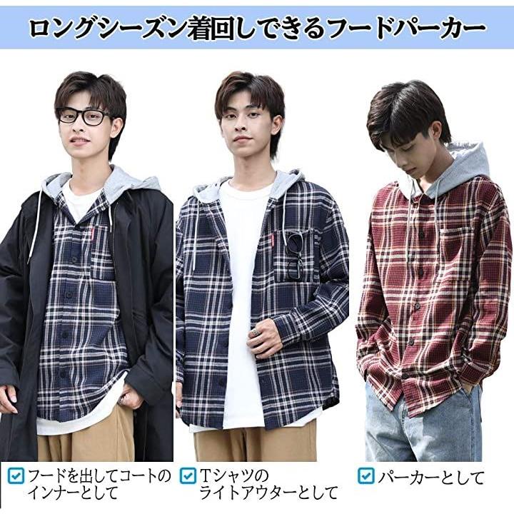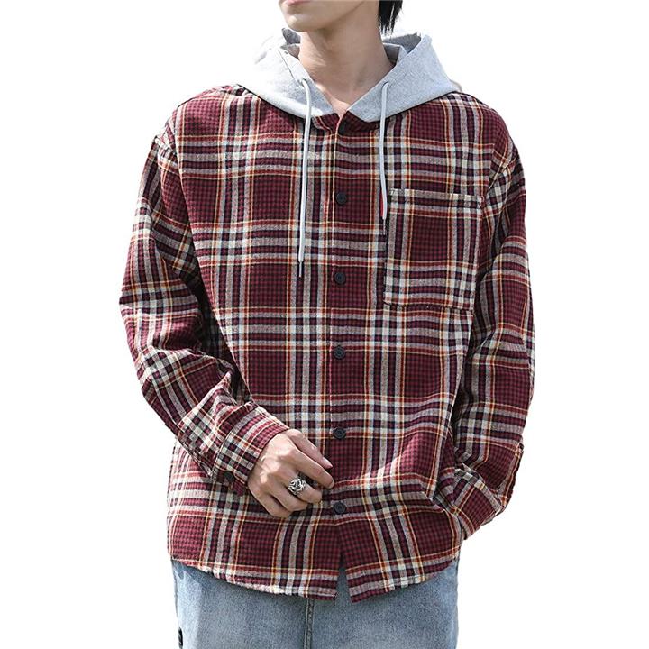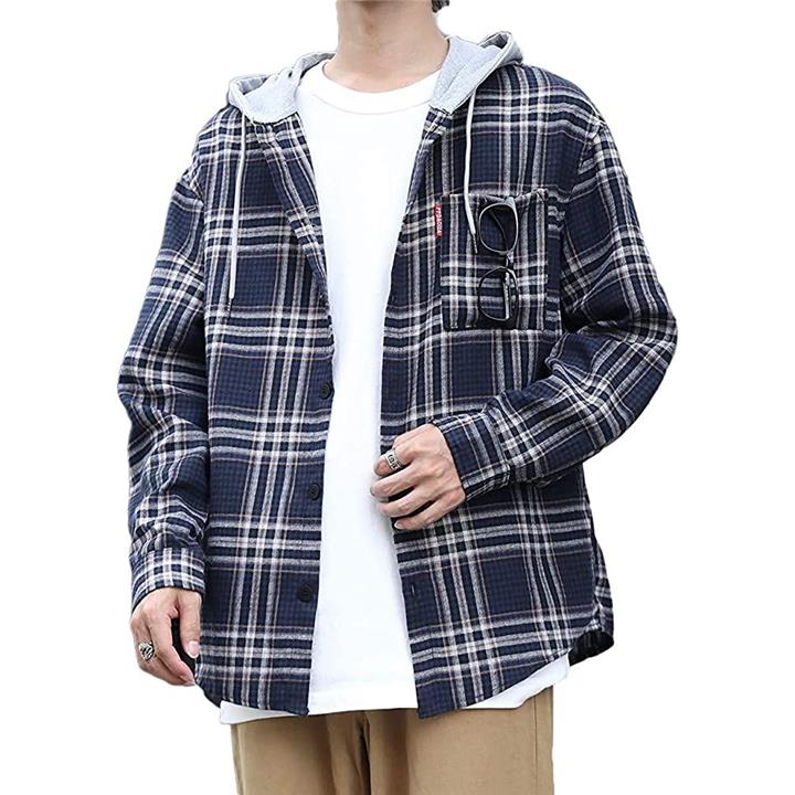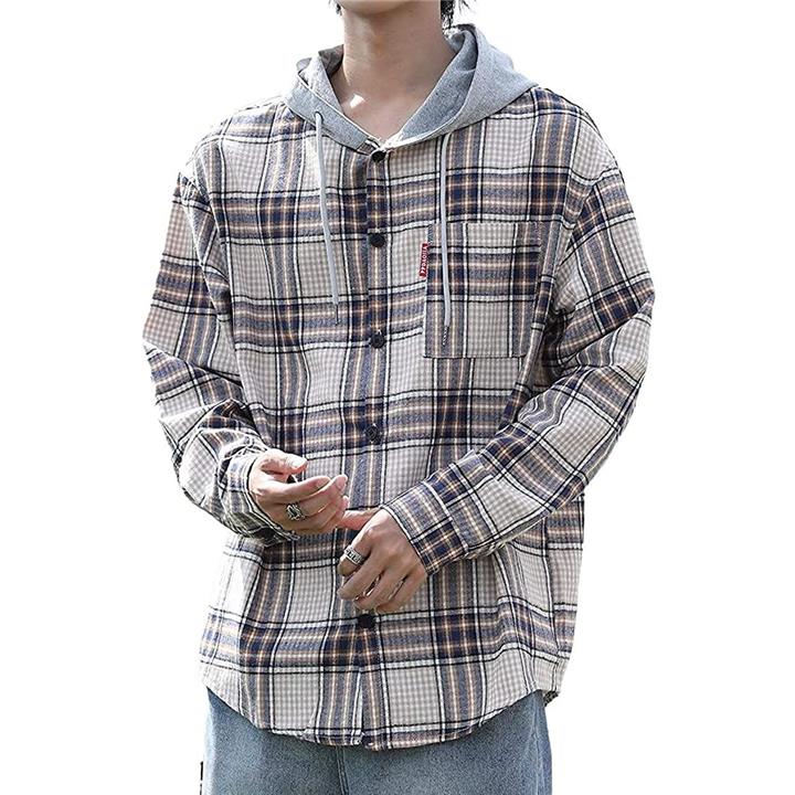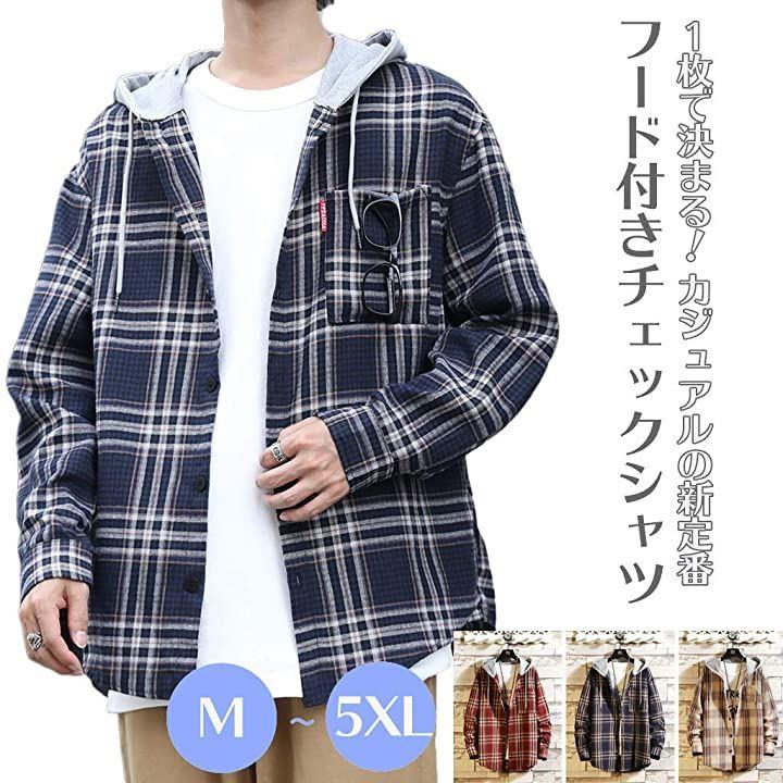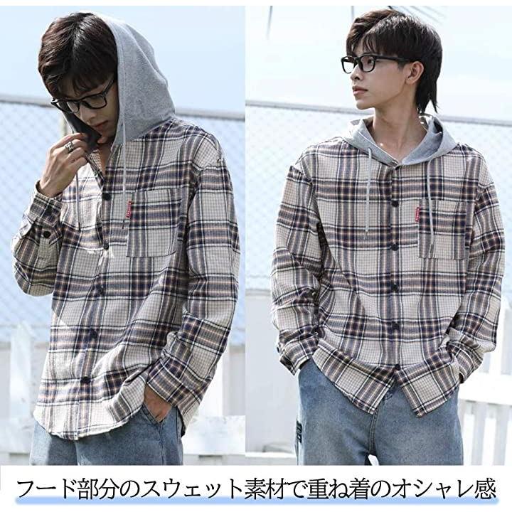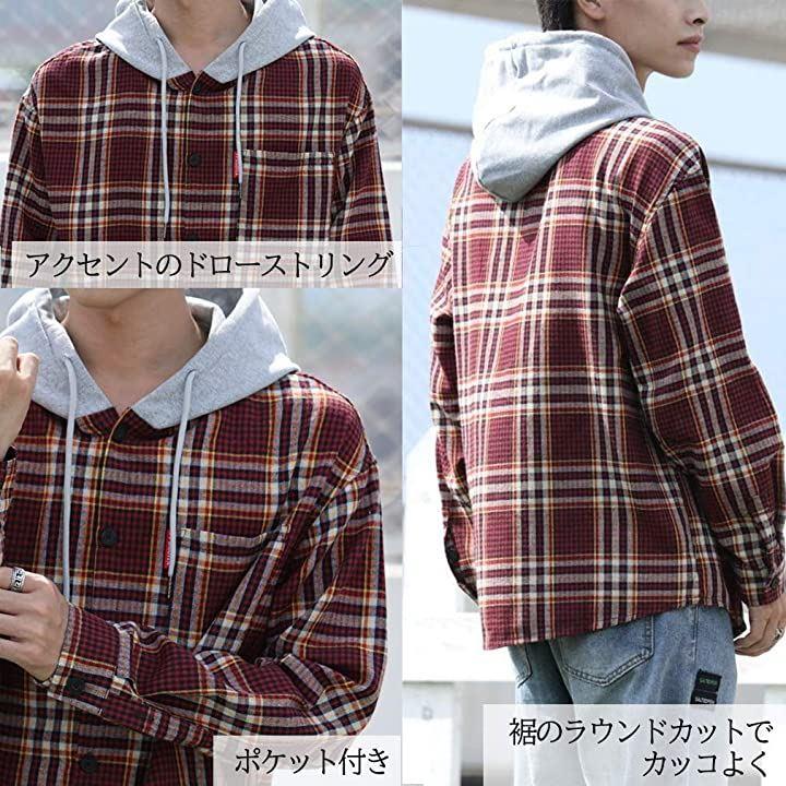 [ジェームズ・スクエア] カジュアル チェックシャツ フード付き チェック柄 シャツ 長袖 メンズ |