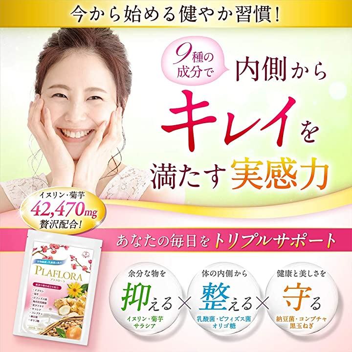 プラフローラ 食物繊維 菊芋 イヌリン 高配合42470mg サラシア ナットウキナーゼ コンブチャ 乳酸菌 ビフィズス菌 梅の花乳酸菌 オリゴ糖 国内産 31日分 厳選9種配合