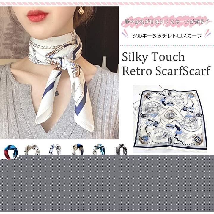 ・クラシカルかつレトロな華やかさが目を引くシルク調スカーフが登場。 滑らかな肌触りと上品なデザイン。