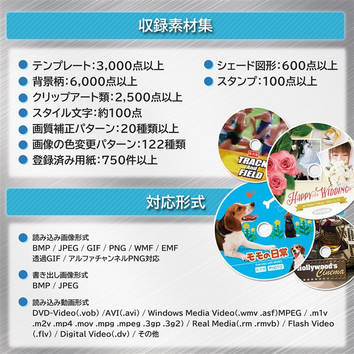 テンプレート:3000点以上 / 背景柄:6000点以上 / クリップアート類:2500点以上 / スタイル文字:約100点 / 画質補正パターン:20種類以上 / 画像の色変更パターン:122種類 / 登録済用紙:750点以上 / シェード図形:600点以上 / スタンプ:100点以上