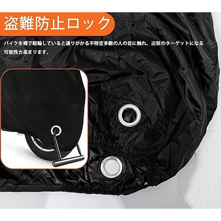 盗難防止設計のバイク車体カバーは、いたずらや風による吹き飛ばしを防ぐことができます。