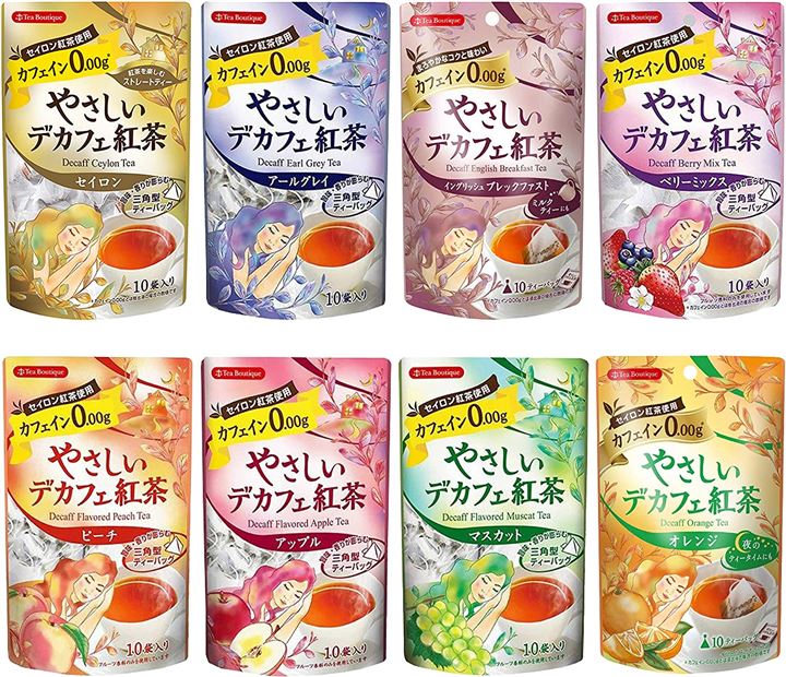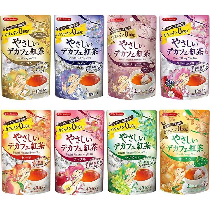 カフェイン0.00gxでも、味と香りにこだわった「やさしいデカフェ紅茶」シリーズからピーチ・マスカット・アップル・アールグレイ・オレンジ・ベリーミックス・セイロン・イングリッシュブレックファーストの8味をセットにした商品です。