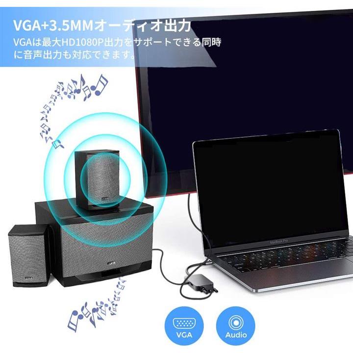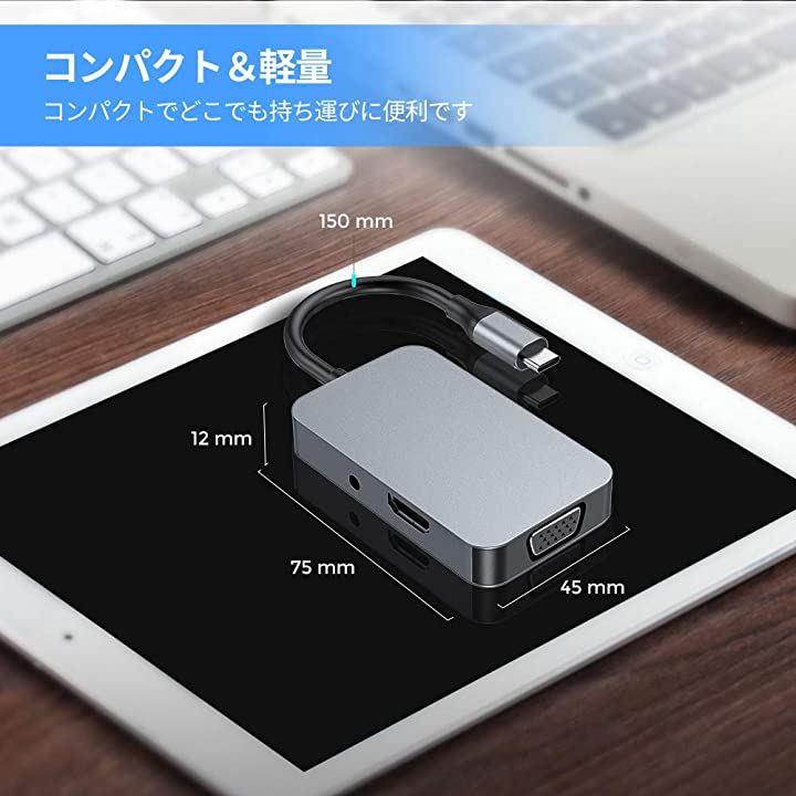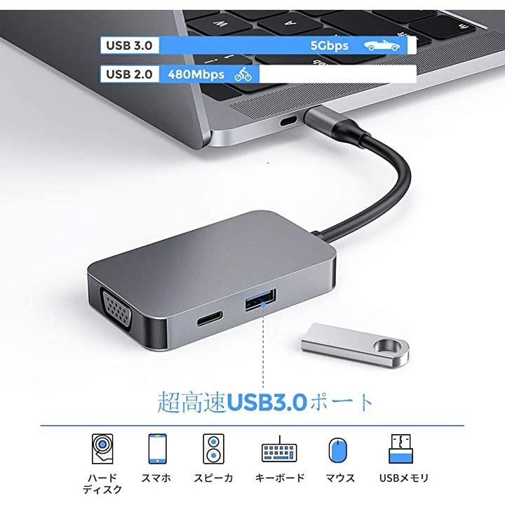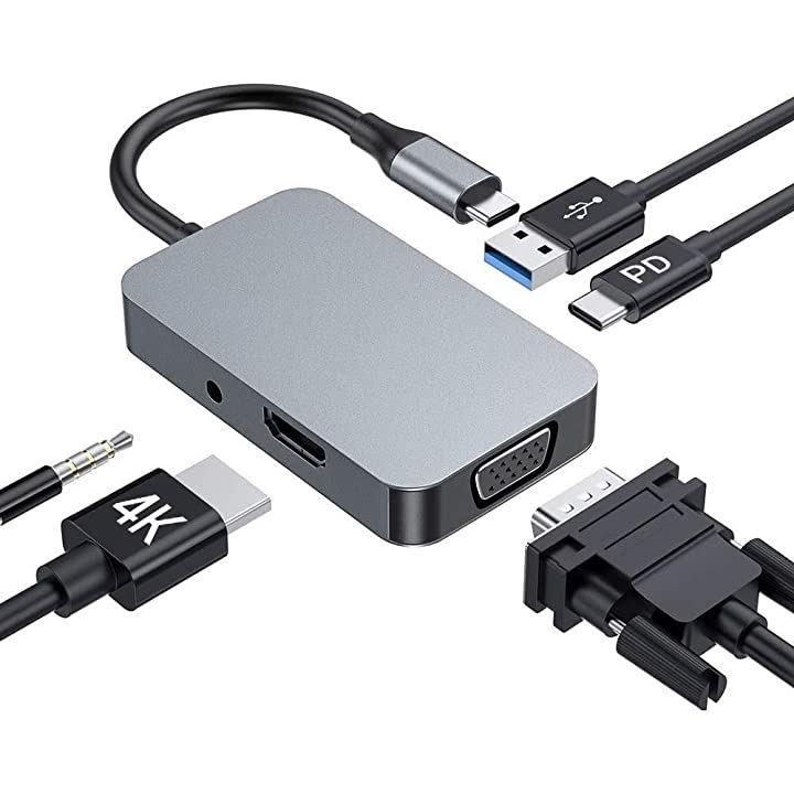 ・「USB-C ハブ 5in1」PD充電ポートx1、HDMIポート(4K @30Hz)x1、VGAポート(1080P)、3.5mmイヤホンジャックx1、USB 3.0x1を搭載しています。