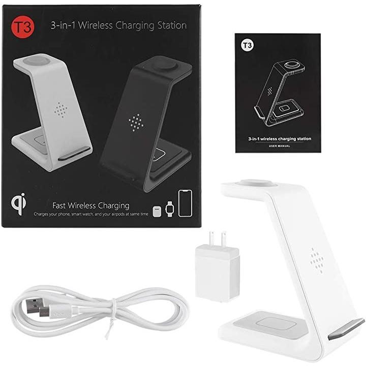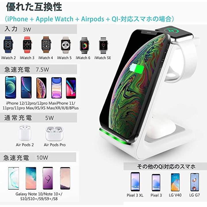 互換品ワイヤレス充電器 置くだけ充電 Qiスマホ機種全対応 3in1急速充電 Apple Watchスタンド Airpods充電器 iphone/Galaxy/他のワイヤレス充電シリーズに対応 9V-2AのQC3.0アダプター付属 白 |