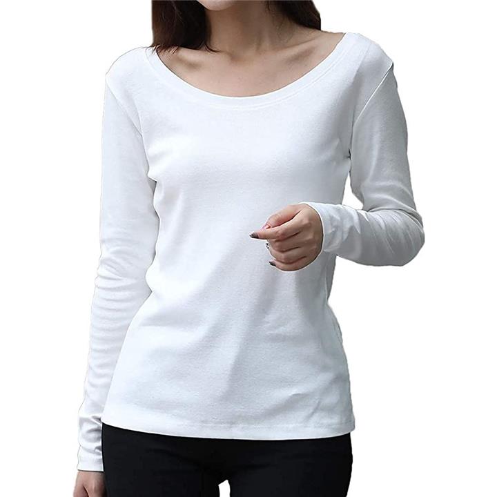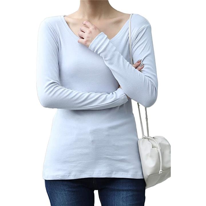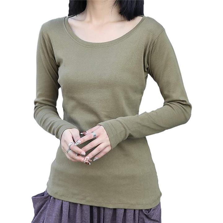 深めのラウンドネックと長めの袖丈でスタイル良く見せてくれるデザインです。