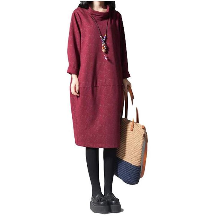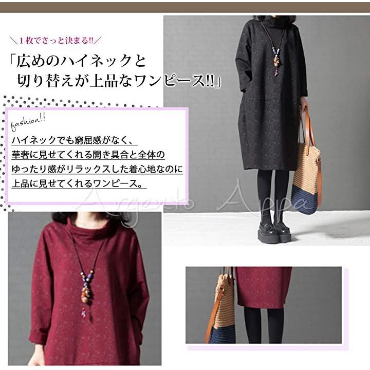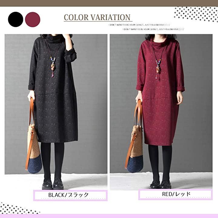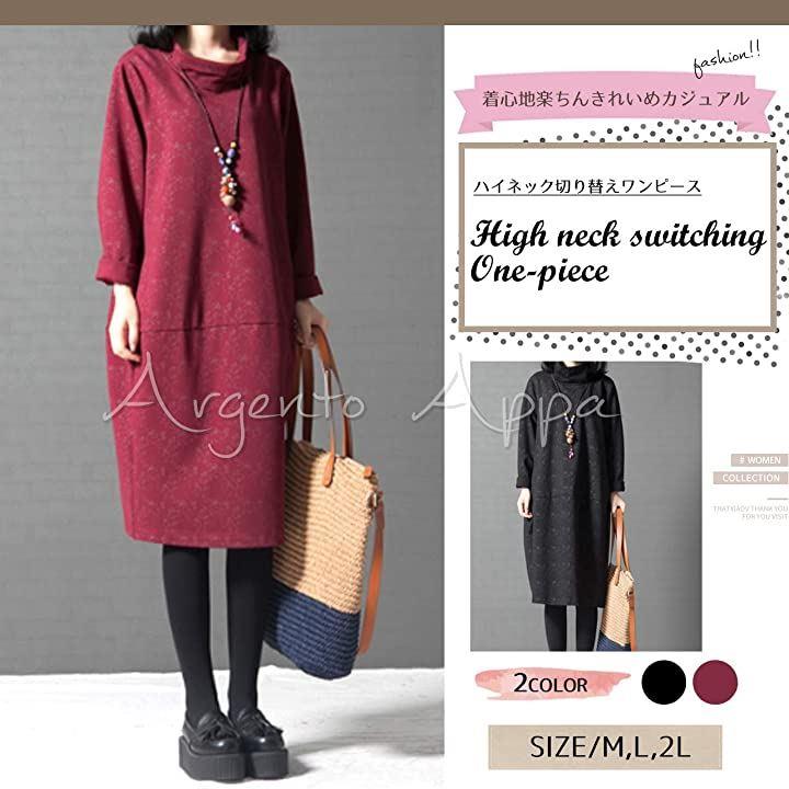 [アルジェント アパ] ワンピース 秋 冬 秋冬 長袖 膝丈 総柄 柄物 レディース シンプル M~2L(レッド, L) |