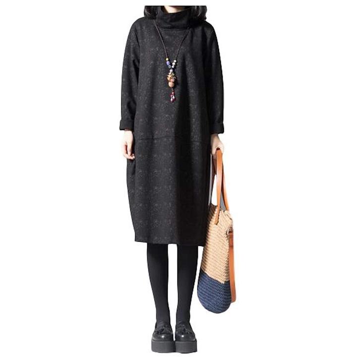 [アルジェント アパ] ワンピース 秋 冬 秋冬 長袖 膝丈 総柄 柄物 レディース シンプル M~2L(ブラック, L) |