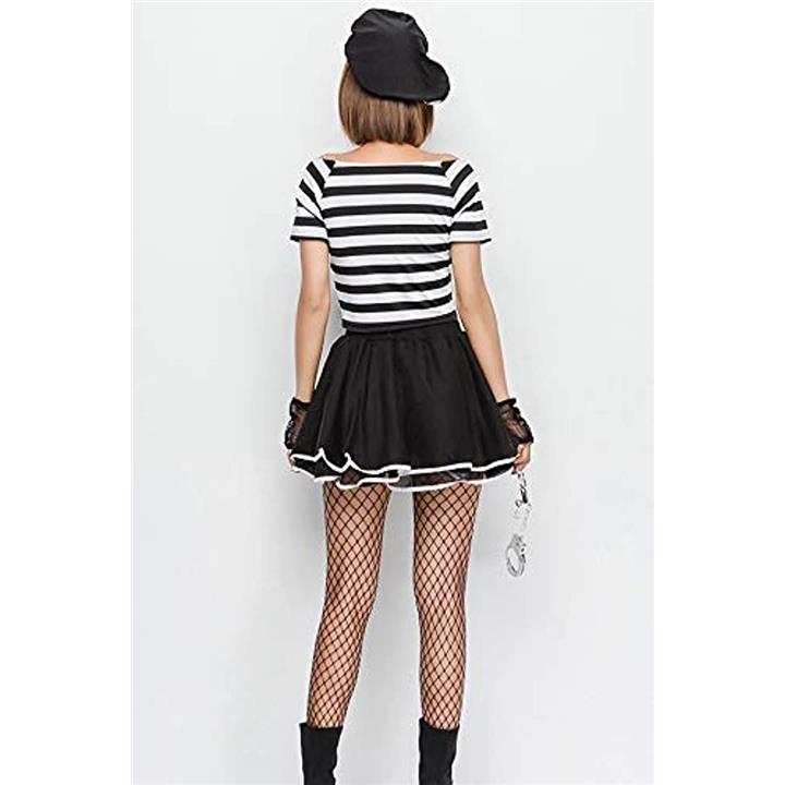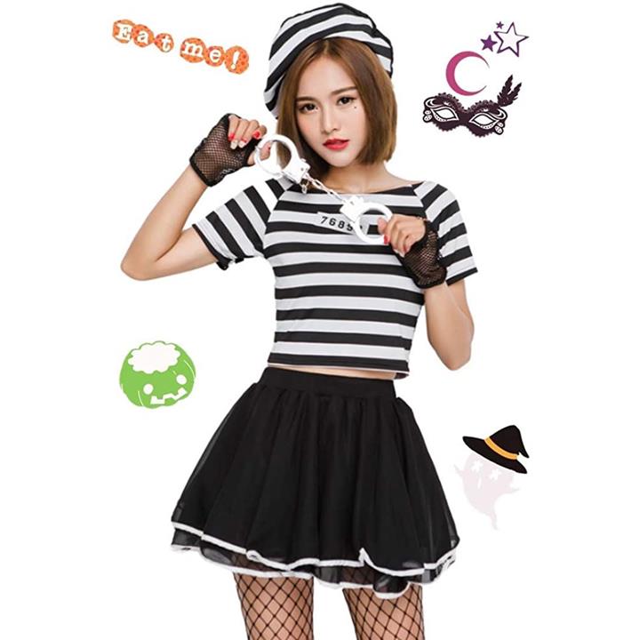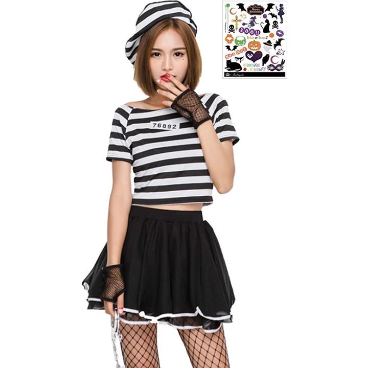 囚人 囚人服 スカート タイプ 手錠&手袋付き コスプレ コスチューム ハロウィン タトゥーシール付き2点セット レディース S753