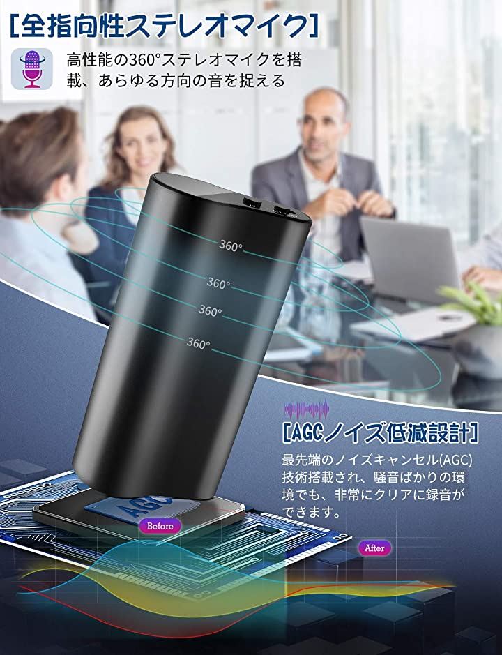 さらに、最先端のノイズキャンセル(AGC)技術を採用して、周囲の騒音を自動的に軽減し、ステレオ録音対応なので、発言者の位置までわかるほどクリアな高音質録音を実現します。