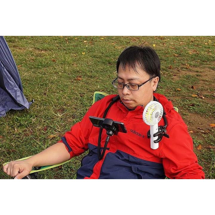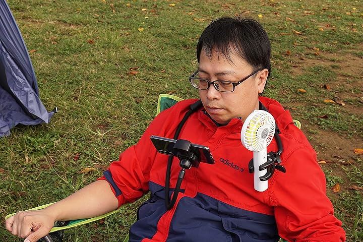 ・「ハンディファン+スマホホルダー」屋外で涼みながら動画を見たくないですか?そんなときは、かぎ爪でハンディファンを掴んで、スマホホルダーにスマホをセット。